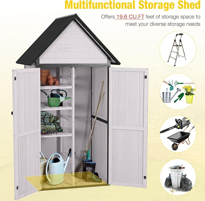 Outdoor Storage Shed,Vertical Wooden Tool Shed with Waterproof Roof,Adjustable 3 Tiers Shelves,Storage Tool Cabinet Box with Metal Frame Sloped Roof for Backyard Garden Patio Lawn (Off White)