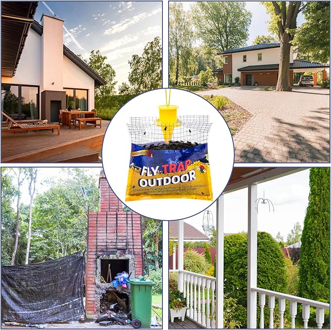 - Disposable hanging fly traps: scientific research confirms flies are strongly attracted to yellow and blue hues, making our color-optimized traps exceptionally effective. Additionally, the natural bait's potent scent - though unpleasant to humans - proves irresistible to flying pests
