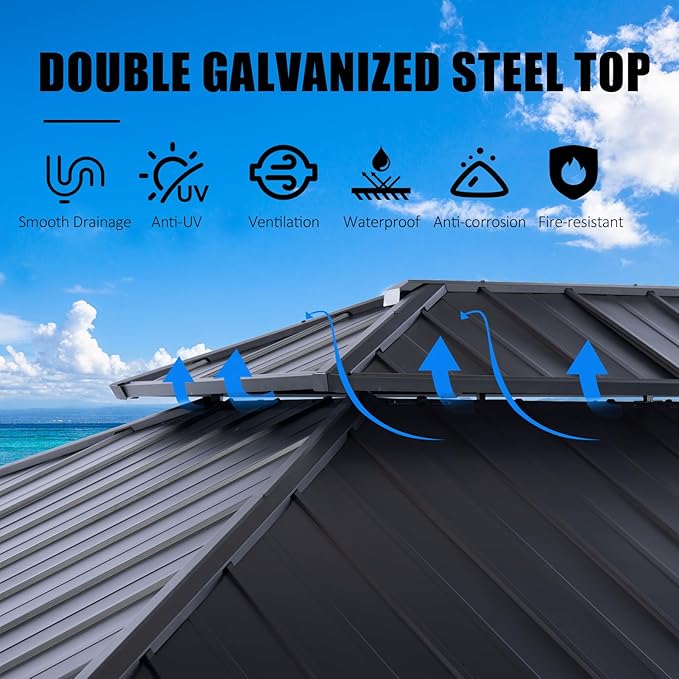 - 【GALVANIZED STEEL ROOF】The heavy duty permanent hardtop gazebo with a metal roof stands strong against weather elements, blocks 99% UV rays and 50% heat.this kind of outdoor gazebo roof is strong enough to withhold much heavy snow and offer unbeatable stability in windy conditions. Galvanized steel construction resists water damage and rust, providing reliable protection season after season.
