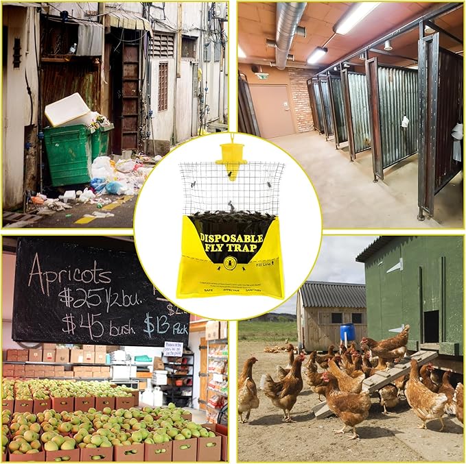 - 2 in 1 fly traps outdoor hanging: the livestock fly bags outdoor disposable of this visual and odor attraction is designed to help you seize more flies. we know that flies prefer yellow, and natural 50g fly bait can attract flies faster.