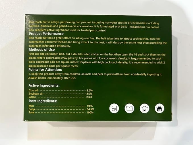 - Invisible Protection & Wide Use: Can be individually pasted on various surfaces. Roach baits also designed for placement in hidden areas such as under kitchen cabinets, pantries, behind appliances, bathrooms, basements, crawl spaces, and near plumbing. Large quantities of bait to ensure cockroaches encounter it. And Note Keep out of reach of children and pets. Avoid contact with skin, eyes, and clothing.