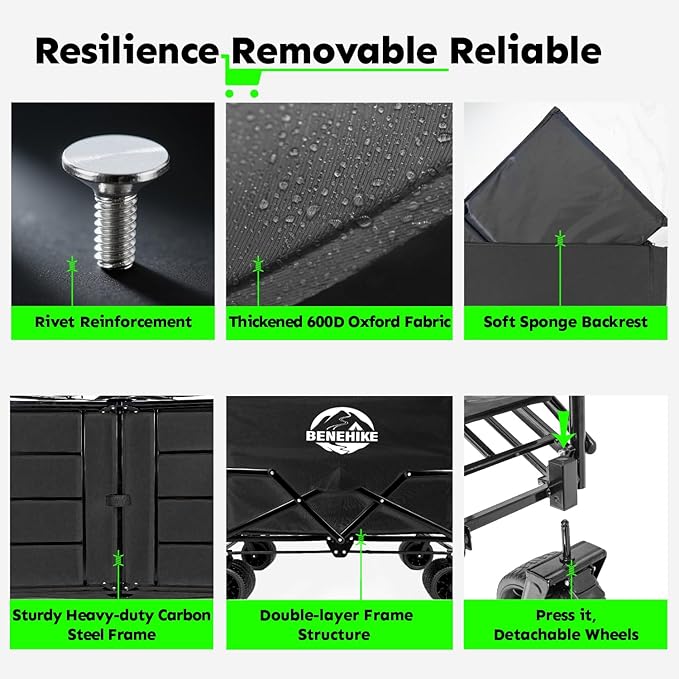 - 【PREMIUM MATERIALS & STURDY CONSTRUCTION】BENEHIKE Collapsible Camping Wagon is made of 600D Oxford cloth and foam, offering a stable and comfortable seating feeling similar to regular chairs while camping, watching events, or relaxing outdoors, relieving fatigue from prolonged standing.