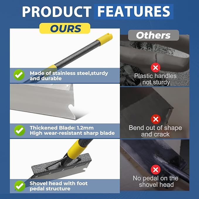 - ✅ GET YOUR GARDEN WORK DONE EFFICIENTLY: The flat shovel's 11-inch wide blade is wider and thicker, covering a large area so you can work faster and more efficiently. The foot pedal on the head of the shovel lets you apply more force to remove stubborn debris or grass clippings with ease.