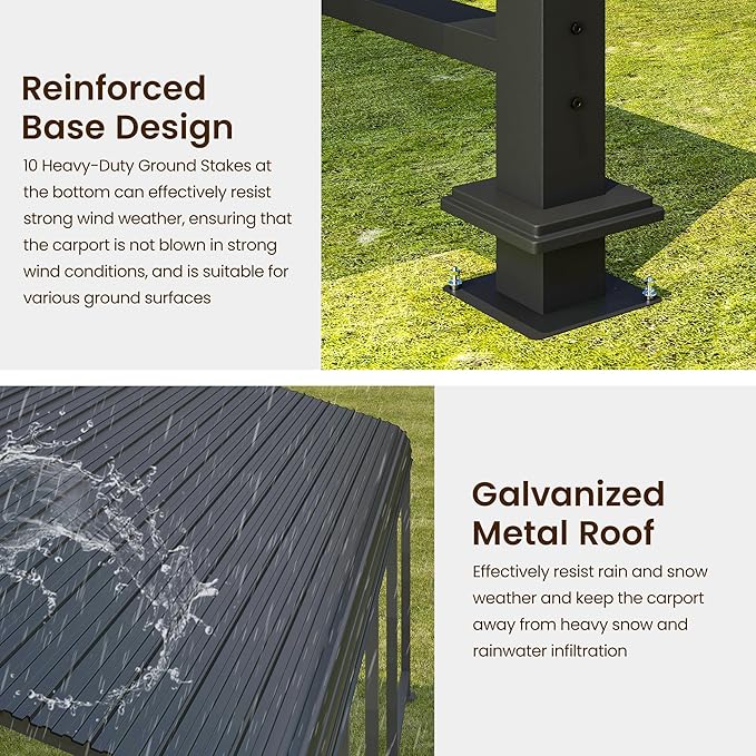- All-Weather Shield: Designed with waterproof strips to keep the interior dry during rain and a UV-resistant coating to block harmful sun rays, this carport ensures reliable protection no matter the weather—rain, sun, or snow. Rest easy knowing your vehicle is fully covered.