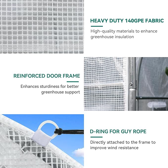 - ZIPPER DOOR- The greenhouse is equipped with zipper doors, you can use the zipper to lock the door to protect the plants. Safety measures and professional installation are highly recommended