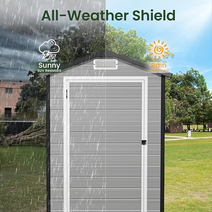 - All-Weather Shed - The GVDV garden shed with floor is made using high-grade thermoplastic resin to achieve long-lasting durability; The 12mm thick double-wall resin panels are resistant to warping and cracking; Its corrosion resistance, waterproofing, and UV resistance make the shed suitable for various weather conditions; The fade-resistant materials promote a long lifespan and low maintenance costs