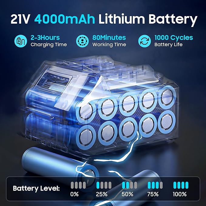 - Dual-Battery System for Extended Runtime Included are 2x 21V 4000mAh rechargeable batteries, providing 30 minutes per battery of continuous use. The fast charger quickly replenishes power, minimizing downtime so you can finish large-scale cleaning tasks without interruptions—ideal for maintaining a spotless yard or workspace