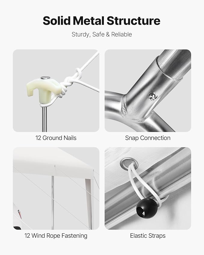 - Stable Structure: The tarp of the car canopy is secured with elastic ropes, while snap-together parts and ground stakes keep the base fixed. Full welding between pipes enhances the overall stability of the frame, improving its wind resistance.