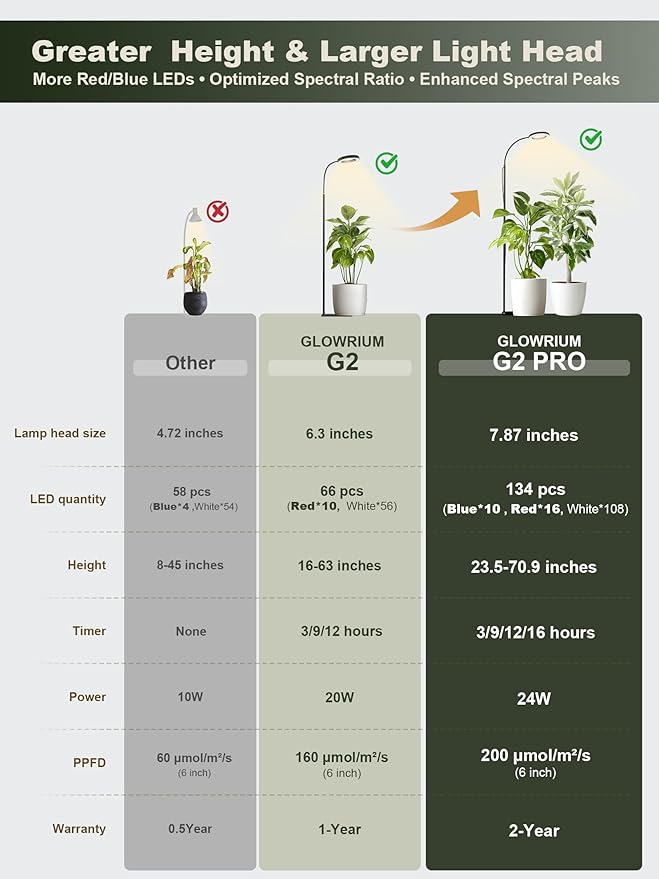- 【POWERFUL, EFFICIENT & LONG-LASTING】: Engineered for performance, this 24W grow light delivers powerful, energy-efficient illumination with a 50,000-hour lifespan. At a distance of 6 inches, tested PPFD output reaches up to 200 μmol/m²/s, ideal for supporting plants from seedlings to flowering stages. Perfect for all growth needs without frequent bulb changes.
