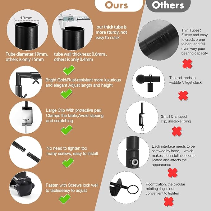 - Stable and Sturdy: Our over the table Rod stand use high quality extra-thick 19mm diameter, 0.6mm wall thickness round metal tubes . Compared with other thin round or square 15mm diameter,0.4mm tubes, our table arch stand has a larger diameter, which is more stable and durable.The tube is not easy to bend, crack or fall over. In addition, the high-quality material also ensures its stability against strong winds during outdoor activities.Table rods with clamps can be used indoors or outdoors
