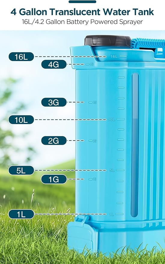 - 4-Gallon Tank: The large-capacity 4-gallon tank supports extended spraying tasks over larger areas. The tank features: A filter mes at the water inlet to prevent debris from clogging the sprayer. A water level indicator to monitor remaining liquid at a glance.