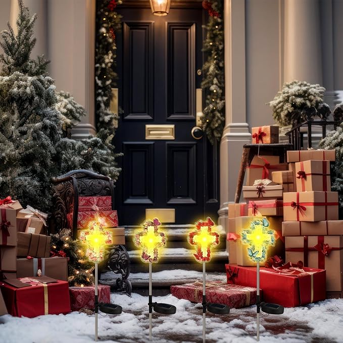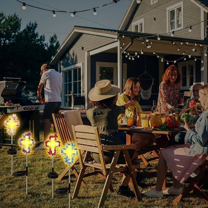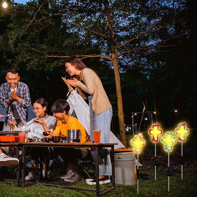 - Package Includes: Our 4 pack exquisite floral cross solar garden stake lights are very elegant and vivid in design, with 4 beautiful ground plug lights in different colors to decorate your garden, when the lights emit a warm glow in the dark, these floral cross solar decorative lighting ensures excellent effect