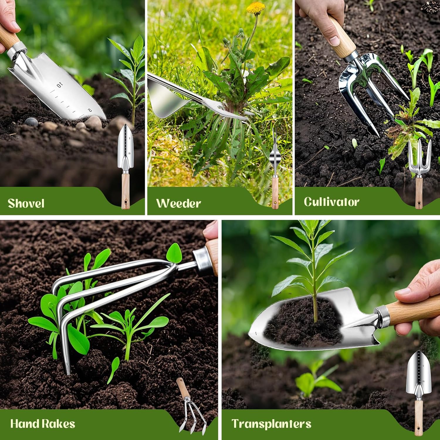 - 【Ergonomic Wooden Handle】In order to realize a more comfortable and effortless use experience, each tool has an ergonomic handle, making them super comfortable to use even for longer gardening sessions. These gardening tools for women men made things easy during digging, carrying, weeding, planting, and pruning. Each tool comes with a handy hanging hole on the handle makes them easy to be stored.