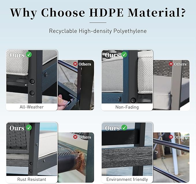 - HDPE Patio Dining Set: Our dining table and chairs are made of High Density Polyethylene (HDPE) recyclable material, which is durable, low maintenance, weather-resistant and environment friendly. Ideal for your backyard, garden, yard, lawn and deck, providing a comfortable and luxurious outdoor dining or gathering place for family and friends