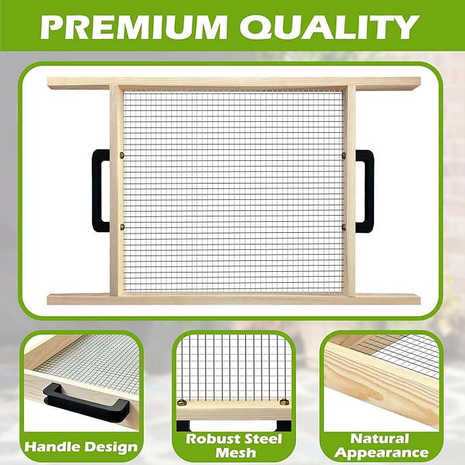 - 【Built to Last – Sturdy and Durable】Crafted with a solid wooden frame and reinforced steel mesh, this sifter is built for heavy-duty performance. Whether you're tackling tough soil or heavy compost, it's durable enough to withstand season after season of consistent use