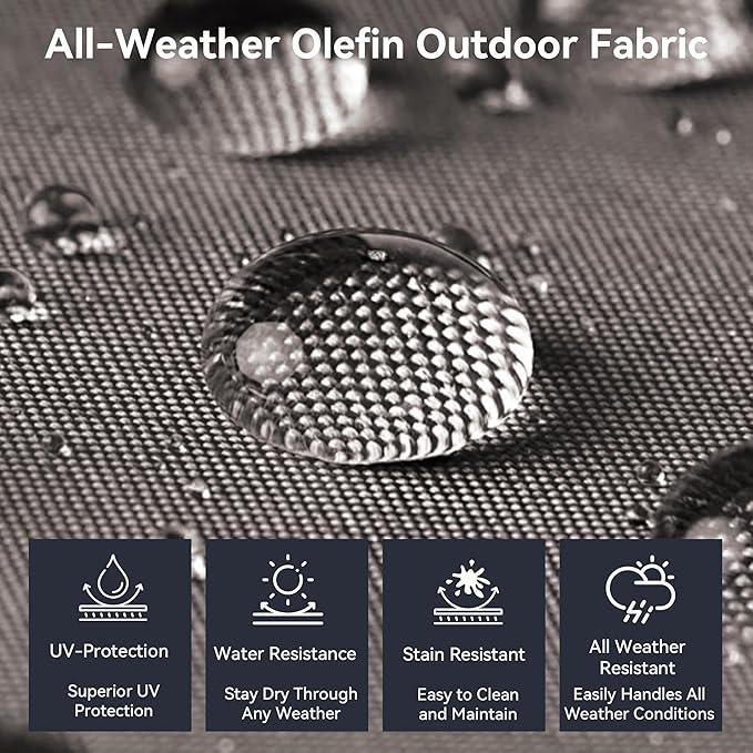 - Premium Thickened Cushion:Our outdoor Patio Furniture Set comes equipped with 6 inches high-density foam cores – ensuring cloud-like comfort and rivaling premium indoor mattresses. The fade-proof and water repellent OLEFIN fabric covers withstand all-weather condition and frequent use while easily maintaining patio furniture elegance.