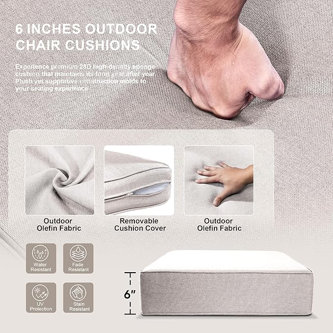 - Premium Thickened Cushion:Our outdoor Patio Furniture Set comes equipped with 6 inches high-density foam cores – ensuring cloud-like comfort and rivaling premium indoor mattresses. The fade-proof and water repellent OLEFIN fabric covers withstand all-weather condition and frequent use while easily maintaining patio furniture elegance.