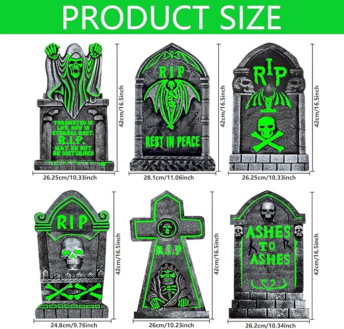 - Large & Eye-Catching Size–Measuring 16.5”x 10”, these large tombstones for graves Halloween demand attention. Perfect for halloween yard decorations, they instantly transform any space into a haunted cemetery.
