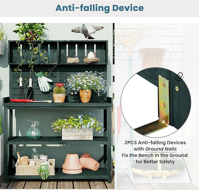 - Anti-Falling Safety Device: There is not always a flat in the garden. For your safety in setting the potting bench, it is designed with an anti-falling device. Just connect the device to a wall for better safety. To strengthen stability, 4 supportive bars are offered to fix in the lower shelves. They can be fixed in any corner until the table is stable.