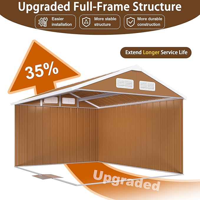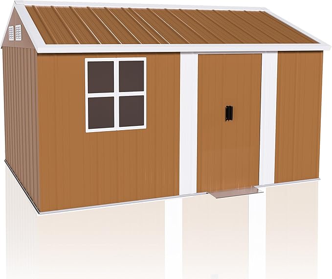 Outdoor Tool Shed 8x12 FT Heavy-Duty Metal Storage Shed with Lockable Door, Windows & Ventilation - Weather-Resistant Roof Garden Shed for Backyard, Patio, Lawn (Brown)
