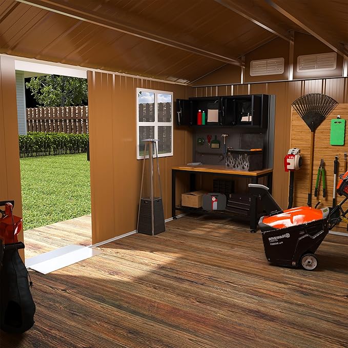 - Spacious 8x12 FT Tool Shed: Our large metal shed provides generous storage space. Ideal for lawn mowers, garden tools, bicycles, and patio furniture.