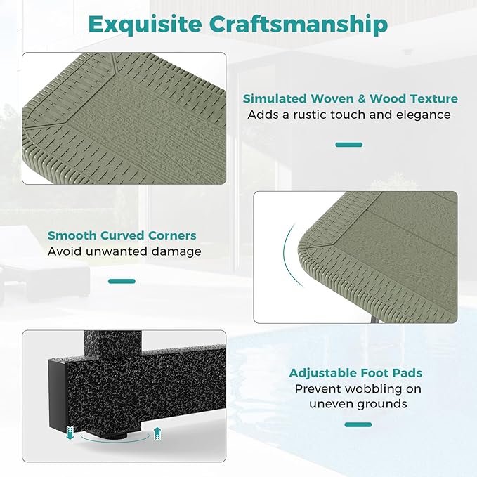 - [Exquisite Craftsmanship]: The tabletop and seats feature a rustic wood grain finish and elegant woven texture that enhance the visual appeal. Therefore, the camping table with benches are perfect addition to your poolside, deck, restaurant or garden.
