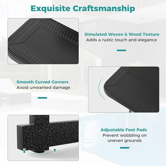 - [Exquisite Craftsmanship]: The tabletop and seats feature a rustic wood grain finish and elegant woven texture that enhance the visual appeal. Therefore, the camping table with benches are perfect addition to your poolside, deck, restaurant or garden.