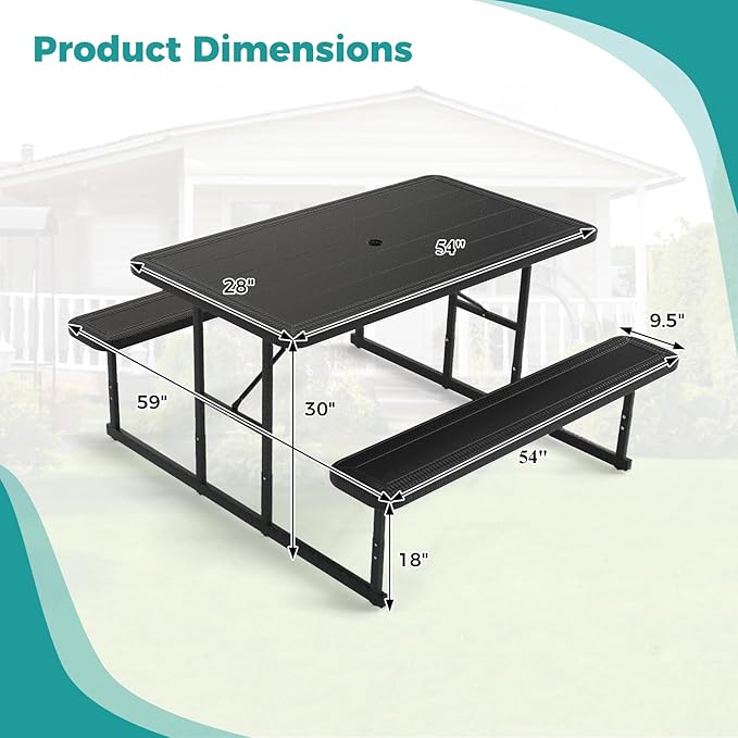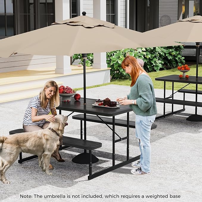 - [Humanized Umbrella Hole]: Thanks to the built-in 1.57” umbrella hole in the picnic table, users can enjoy meals outdoors without the worry of harsh sunlight or a sudden downpour. Note, the umbrella should be secured with a weighted base(not included) for optimal stability.