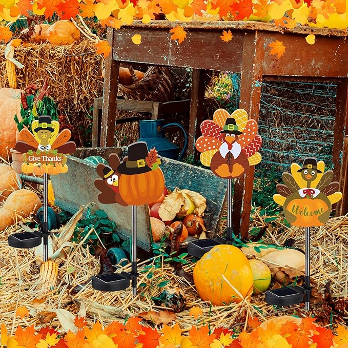 - Creative Turkey Design: our 4 pack of Thanksgiving turkey solar lights design are vivid and the overall atmosphere matches your Thanksgiving and autumn gardens, complementing your garden color scheme; When you use them to decorate your garden, these solar lights can provide gentle lighting in the dark, and believe your neighbors are sure to praise your good taste