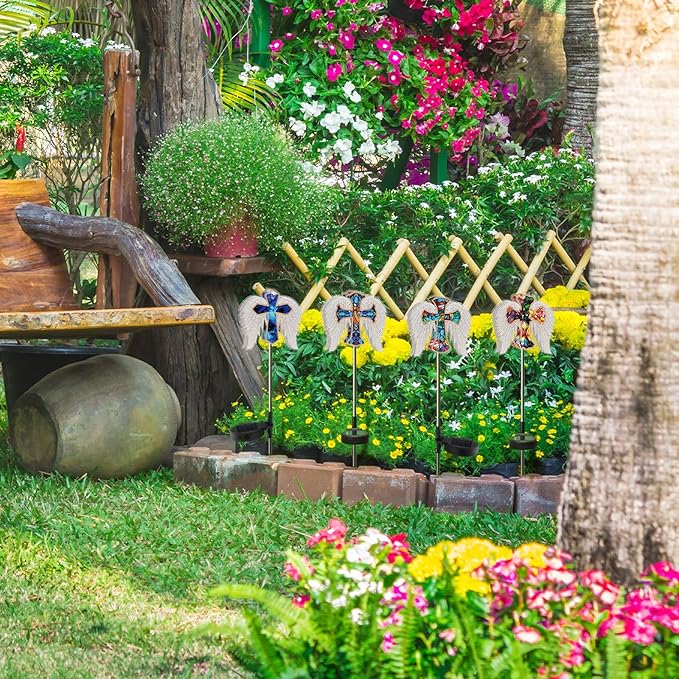 - Exquisite Angel Wing Design: our ground plug lights adopt 4 different colors and styles of angel wings design; The exquisite solar cross lights design is very vivid and clear; I believe that when they come to decorate your garden, the lights emit a warm lighting in the dark; These angel wings design solar decorative lighting can ensure excellent results