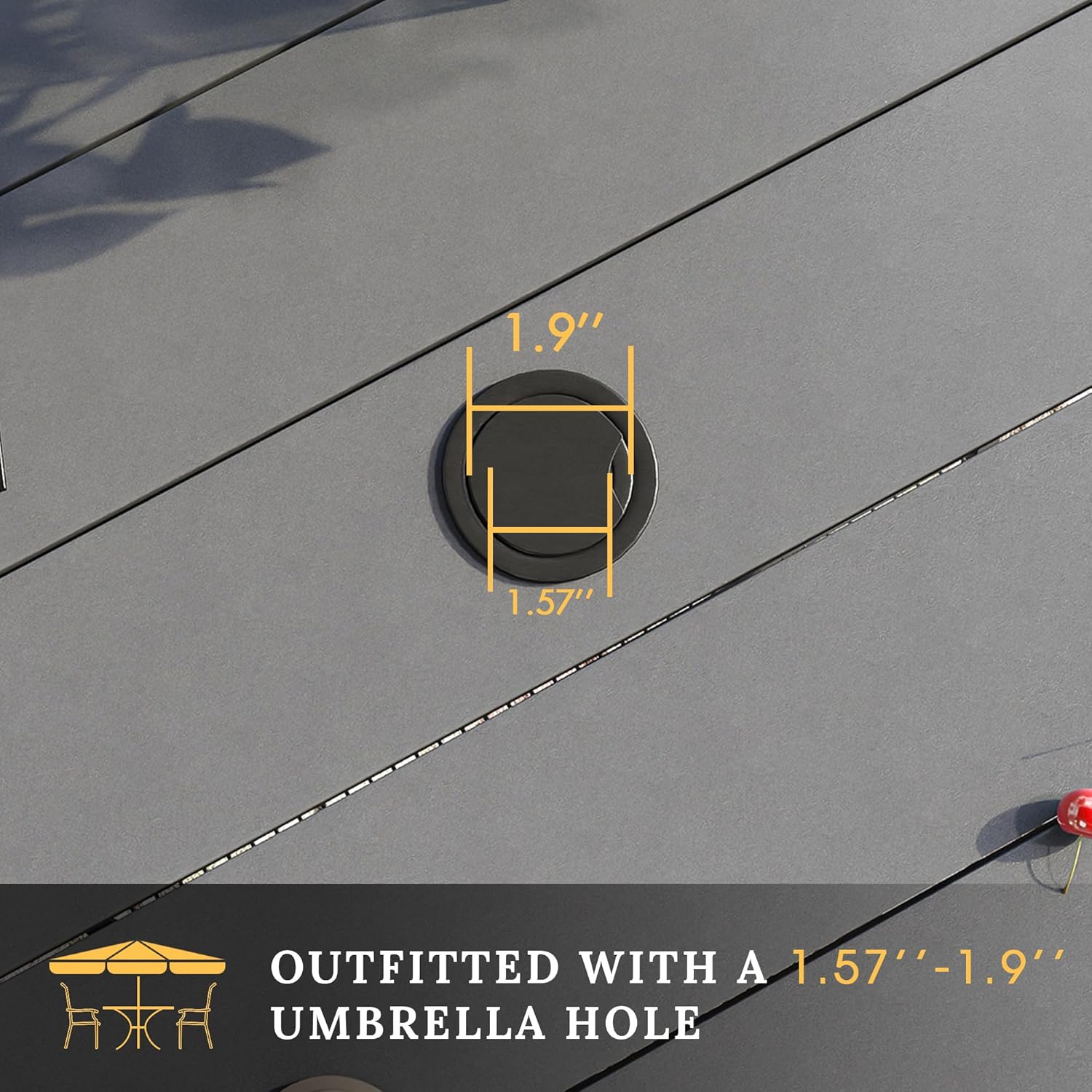 - 【Patio Dining Table】Patio round table set features a powder-coated frame, the bent leg design serves better stability and greater aesthetics, outfitted with an adjustable umbrella hole (1.57" -1.9", hole cover included), opening to secure an umbrella to protect your food and guests from the bright sun