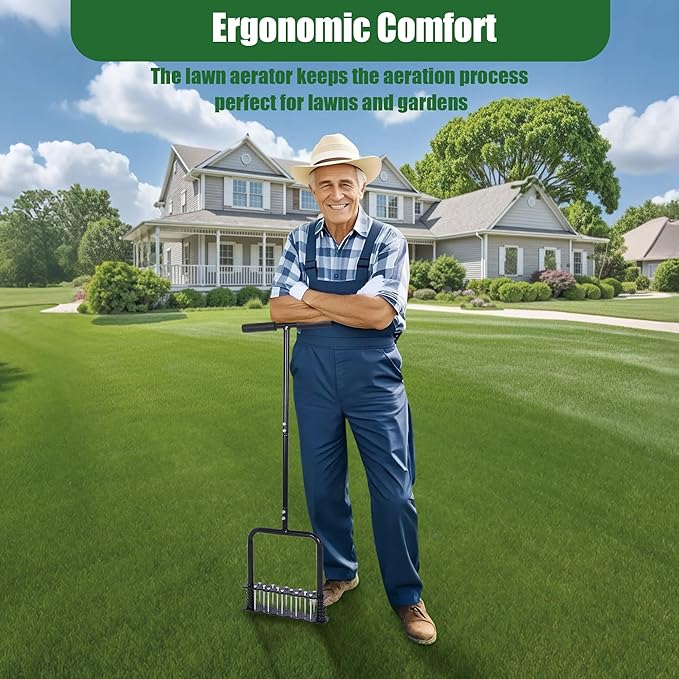 - Durable to Handle Tough Jobs - Aerator lawn tool crafted with a high-strength steel frame and reinforced foot pedal supports full body weight, delivers maximum downward force, and easily penetrates hard clay or compacted soil