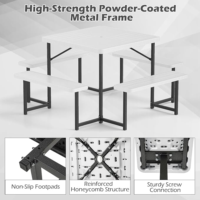 Tangkula 8 Person Picnic Table, HDPE Outdoor Square Table and Bench Set with 4 Built-in Benches, Umbrella Hole, Metal Frame for Garden Yard Patio Lawn