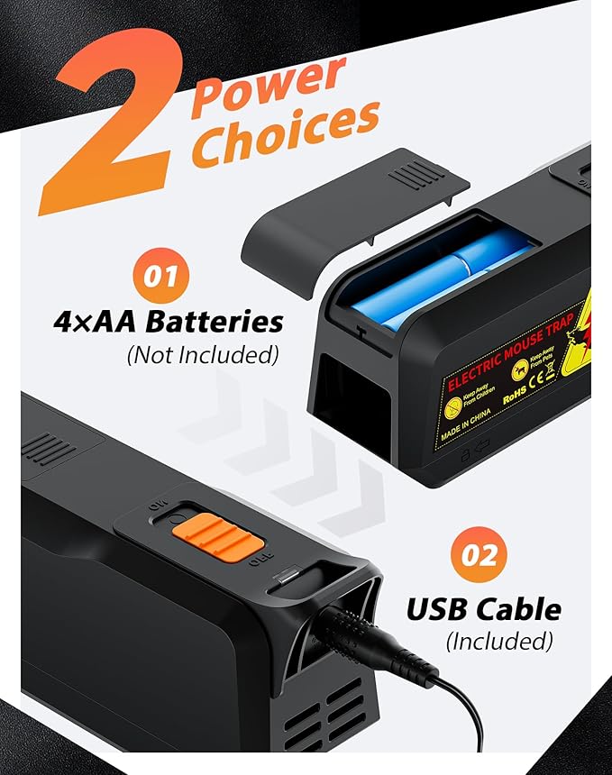 - 【USB or Battery Operated】: Power your electric mouse trap zapper with 4*AA batteries (not included) for cordless flexibility or use the included USB cable for continuous operation. Whether in your kitchen or garage, enjoy reliable rodent control without worrying about outlets.