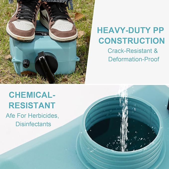 - Durable & Leak-Proof: Crafted from heavy-duty HDPE and ABS materials, this lawn sprayer stands up to drops, weather, and harsh chemicals. The integrated filter prevents clogs by blocking debris, while leak-proof seals at every connection ensure mess-free use. A wide mouth simplifies filling and cleaning, and clear measurement markings on the tank let you track fluid levels instantly.