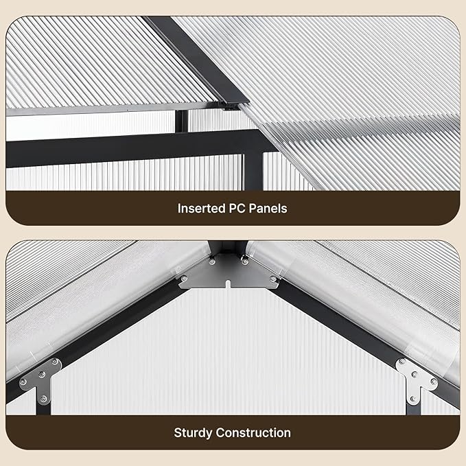 - Sturdy Weather-Resistant Structure:This greenhouse features a reinforced aluminum alloy frame and reinforced corners for excellent stability. It is able to withstand harsh outdoor conditions, including strong winds, heavy rain, and snowfall. For increased durability, seal the panel gaps with silicone (not included) to ensure reliable operation all year round.