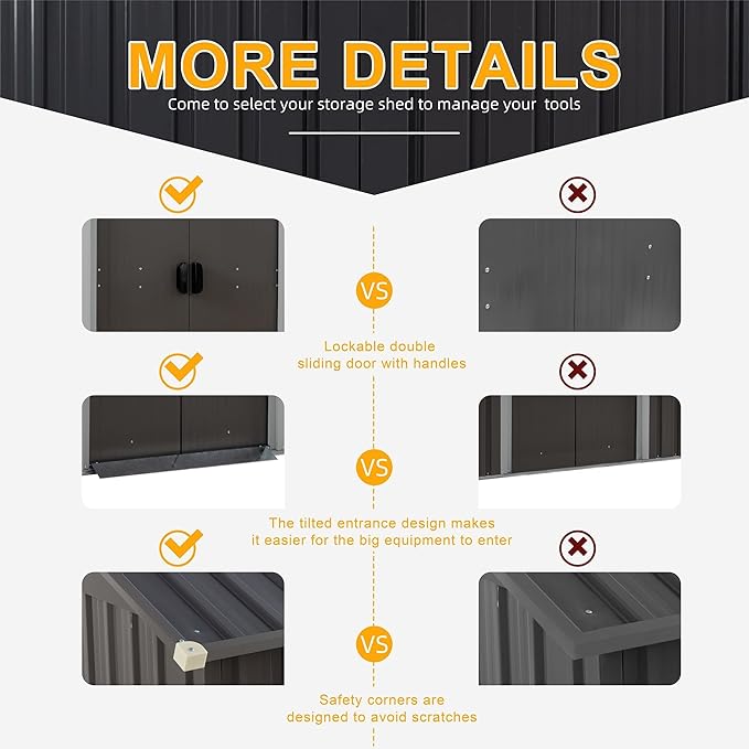 - 【Spacious Storage】This outdoor metal shed offers ample storage for tools,lawn mowers,bicycles,BBQ grills,and more.Its large capacity keeps your yard tidy and meets diverse needs,even doubling as a pet shelter or greenhouse.Stay organized effortlessly.