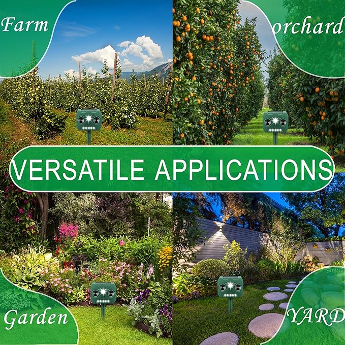 - 【New Upgrade Deer Repellent】The ultrasonic mouse repellent features state of the art ultrasonic technology, new upgrade passive infrared sensor (PlR) sensitively detects movement and triggers the ultrasonic speaker to emit powerful that people can't hear ultrasonic waves, accompanied at the same time by an alarm sound, this combination of visual and auditory stimuli effectively keeps animals away from the protected area in a safe and humane manner.