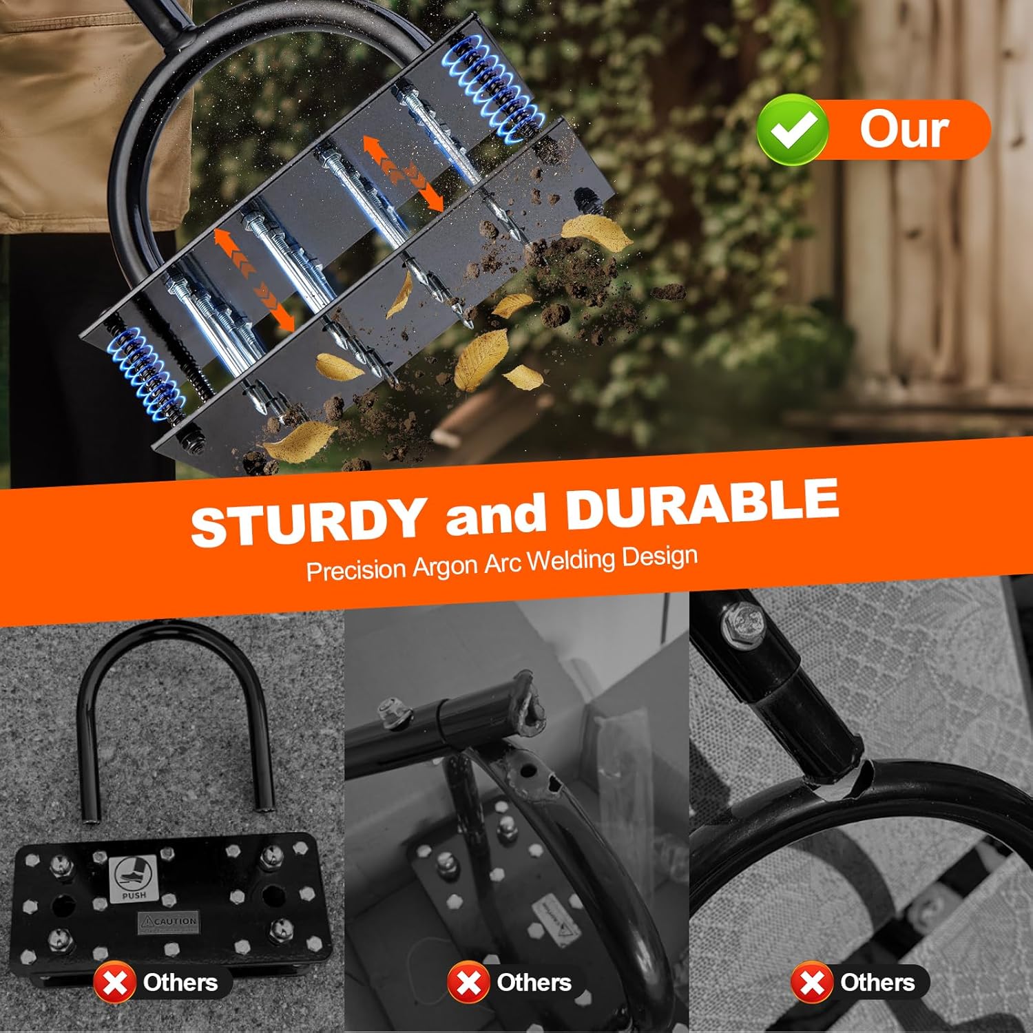 - 【Double-Layer Spring Design】Bluesea manual lawn aerator features an innovative built-in spring mechanism that automatically shakes off soil and debris after each aeration. The reinforced springs prevent jamming and ensure smooth retraction, making operation easier and safer while eliminating the risk of accidental injuries.