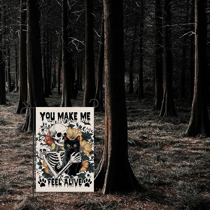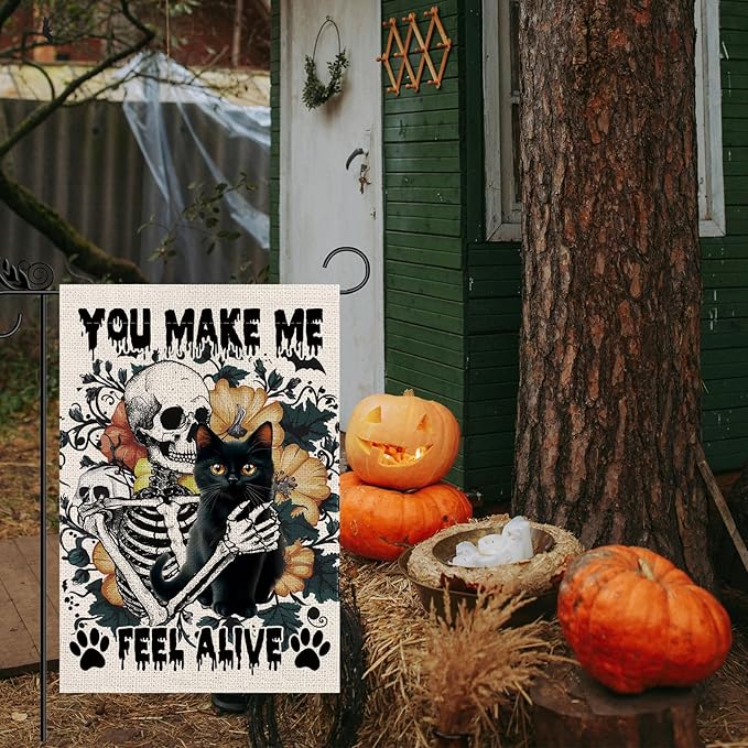 Halloween Garden Flag Skeleton and His Black Cat Vertical Double Sided Flags for Holiday Farmhouse Patio Yard Outdoor Party Decor Decorations Gifts - 12.5 x 18 Inch