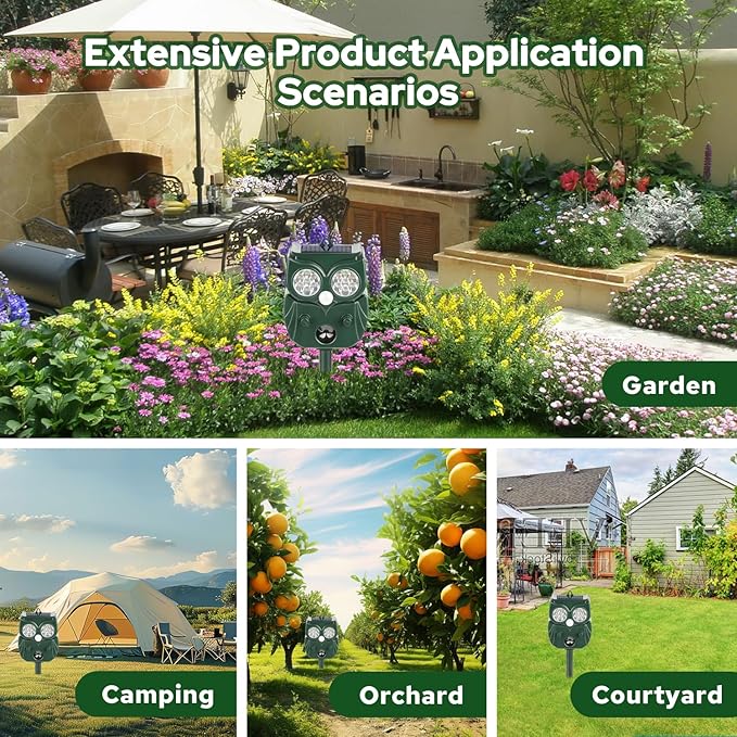 - Advanced Motion Detection Technology: Our Solar Ultrasonic Animal Repeller features a cutting-edge PIR motion sensor that detects motion within a 120-degree arc and up to 26 feet away. With 5 working modes, it emits ultrasonic waves (13.5-45kHz) and flashes LED lights to humanely and effectively drive away deer, squirrels, moles, rabbits, cats, skunks, birds, chipmunks, raccoons, gophers, dogs, rats, and more.