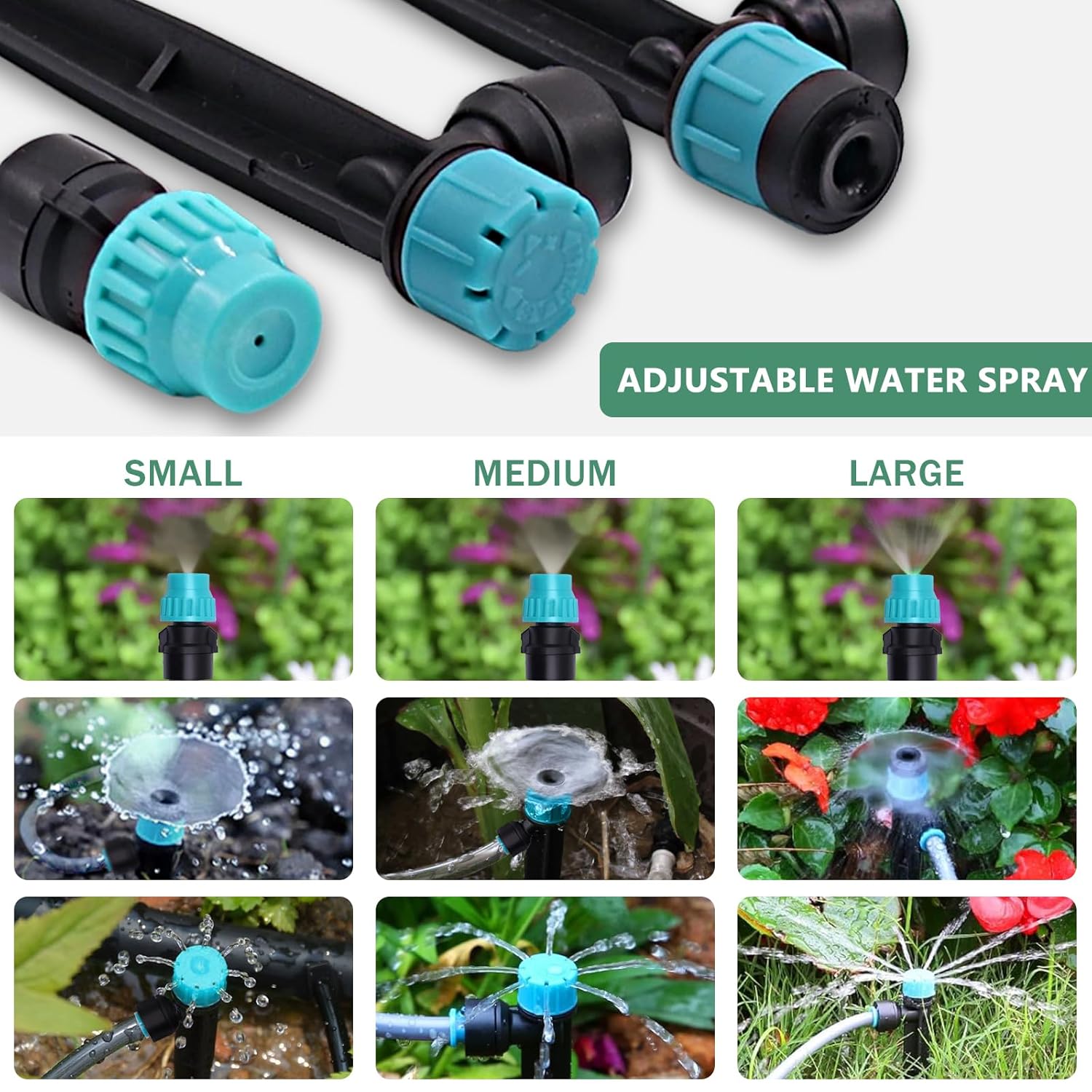 - 【Adjustable Sprayer for Versatile Use】The irrigation system delivers targeted hydration right to the root zone. Our micro drip irrigation kit comes with 3 types of sprayers( microdroplets, sprays, watering), each with individual adjustable nozzles that cater to different watering needs. This feature makes our irrigation system versatile, perfect for a variety of settings such as lawns, patios, greenhouses, and vegetable gardens.