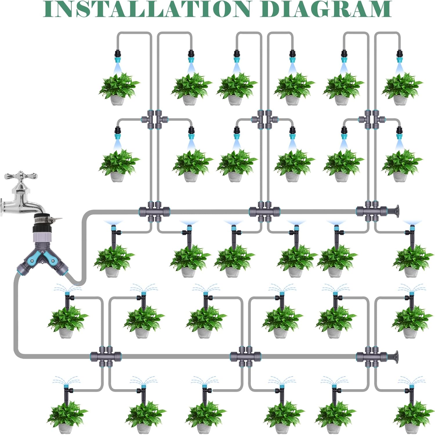 - 【Plug & Play with Quick Connect Design】Say goodbye to complicated installations—this drip irrigation system features quick-connect fittings that snap together effortlessly, ensuring a leak-proof and secure connection. The included six-way, and tee connectors allow you to design the perfect layout for raised beds, potted plants, or greenhouse irrigation systems.