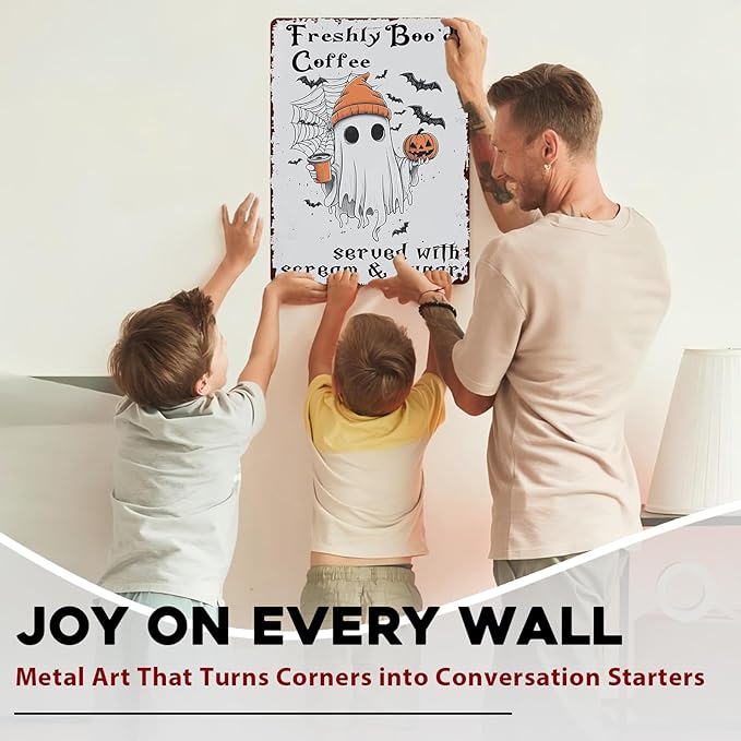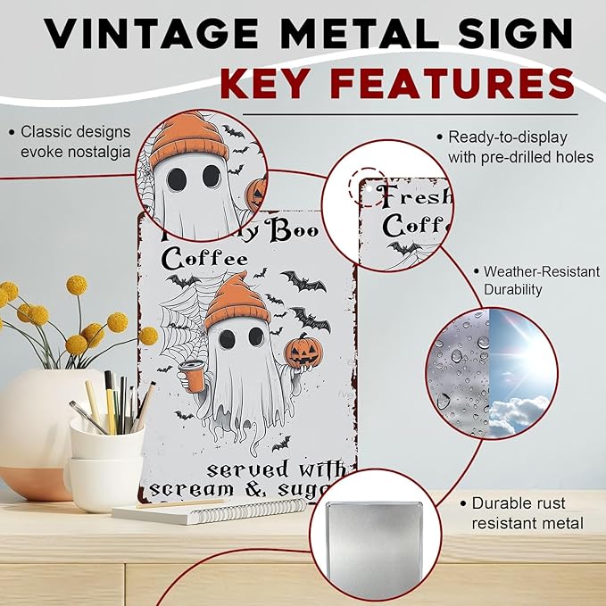 Halloween Rustic Metal Tin Sign Freshly Boo’d Coffee Vintage Fall Decor Retro Tin Plaque Kitchen Wall Art Metal Poster Home Iron Painting Wall Decor 12x16inch