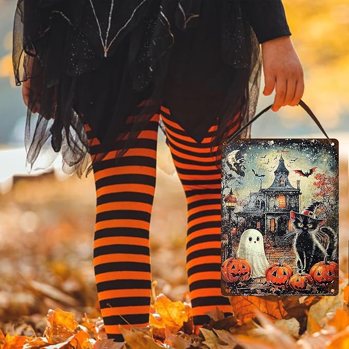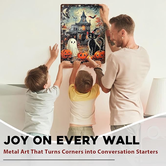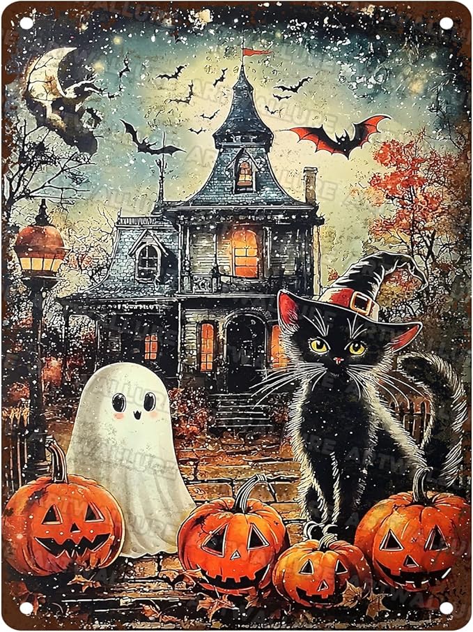 Halloween Black Cat Vintage Sign Funny Ghost Pumpkin Metal Tin Sign Halloween Bat Decor for Home Bar Kitchen Hotel Dining Room Coffee 12x16inch
