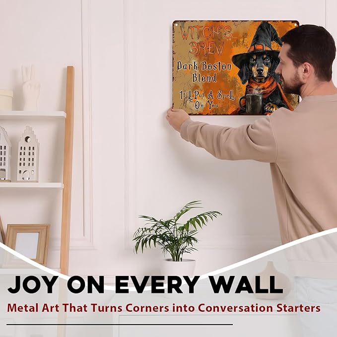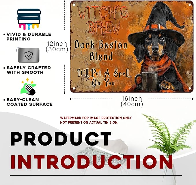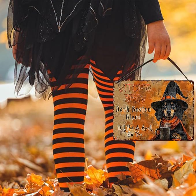 Funny Dog Halloween Metal Tin Sign Dachshund Witch Coffee Rustic Wall Art Vintage Tin Plaque Retro Metal Poster Iron Painting Home Decor 12x16inch