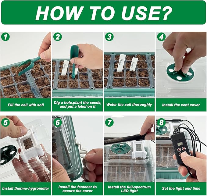 - Seed Starter Tray With Grow Light:An easy-to-use kit with 2 propagation sets (72 cells), 4 full-spectrum strip grow lights, and an intuitive controller for brightness/timer adjustments. Includes USB adapter, 2 hygrometer/thermometers, 2 tools, and 20 labels. Customize light for seedling stages—making plant growth effortlessly easy. Compact & portable, it's perfect for indoor planting in tight spaces—simple setup, pro results.