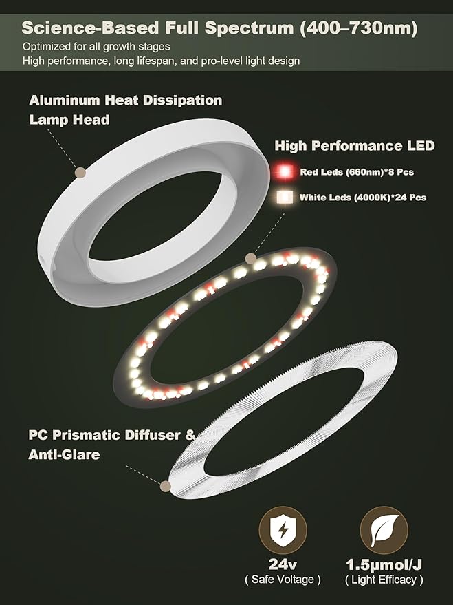 - 【Durable Build & 2-Year Warranty】: Engineered for longevity with a heat-dissipating aluminum alloy lamp head, a durable aluminum alloy telescopic pole (extending 7 inches), and a tough PC Prismatic Diffuser(60° wide-angle light), ensuring an impressive 50,000-hour lifespan. Plus, enjoy peace of mind with our 2-year warranty on these plants grow lights. Choose GLOWRIUM for reliable, long-lasting support for your indoor oasis!