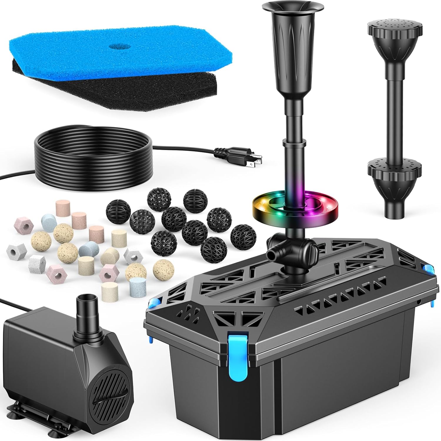- 🌊 【Highly Efficient Filtration System】The pond pump filter for filtration, pumping, and fountains in one, which meets all the requirements of a functioning pond ecology. Multiple filtration systems (2 filter sponge /10 bio-balls /Ceramic Rings) effectively clean all types of impurities and keep the water clean. Providing a healthy environment for aquatic plants and fish growth, low energy consumption and high efficiency, durability under long-time continuous work.