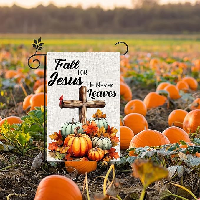 - Small Fall Garden Flag Size: This Fall for Jesus He Never Leaves garden flags for outdoor 12 x 18 double sided can be used with any standard garden flag stand (Only Garden Flag, Flag Stand Not Included).